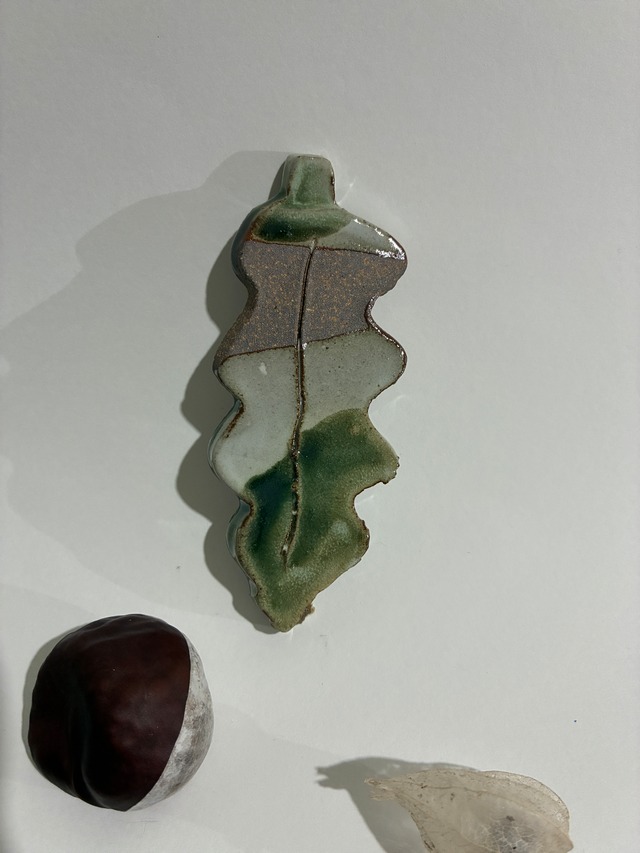 サイズ10cm×4、5cm×5mm 乳白に織部釉 綺麗なドットの葉っぱの出来上がり 金具付きなので壁掛けにもできます