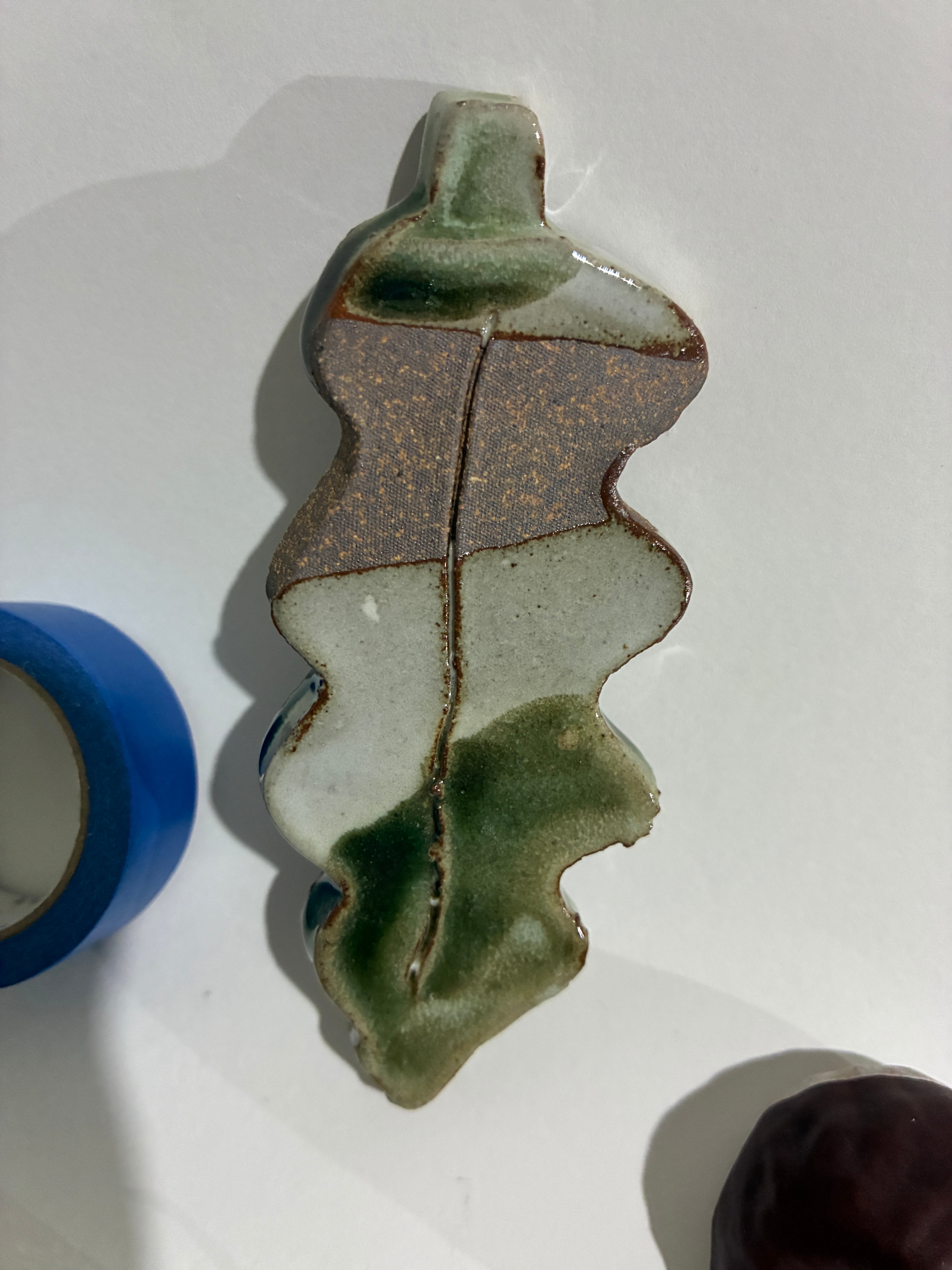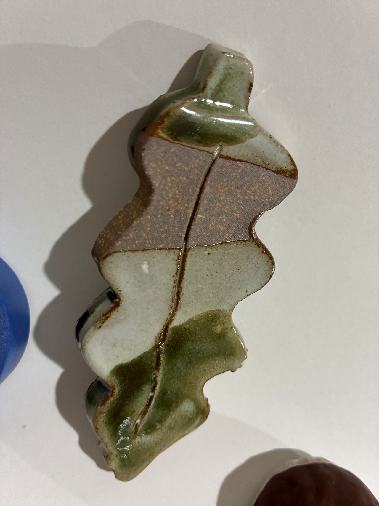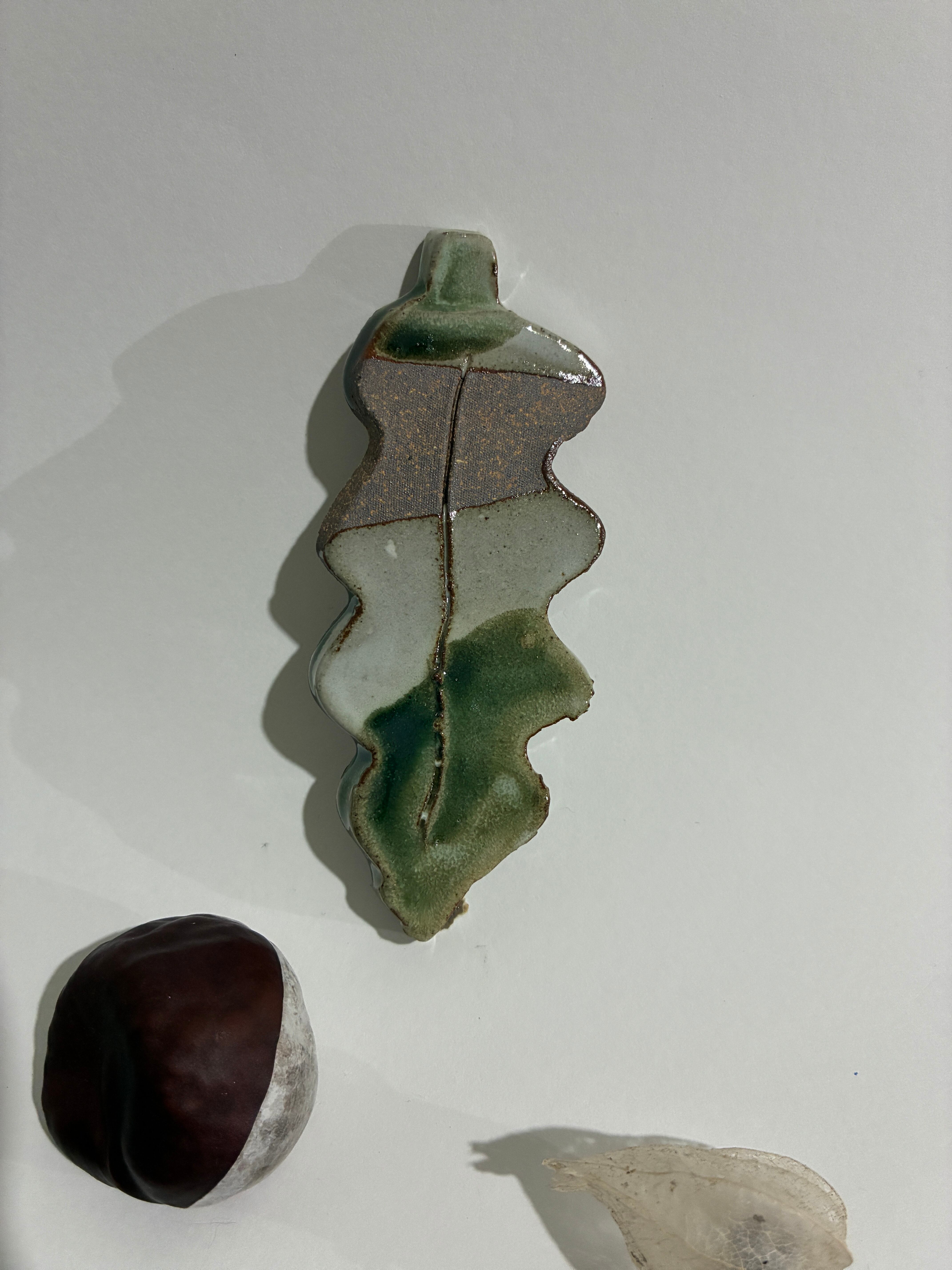サイズ10cm×4、5cm×5mm 乳白に織部釉 綺麗なドットの葉っぱの出来上がり 金具付きなので壁掛けにもできます