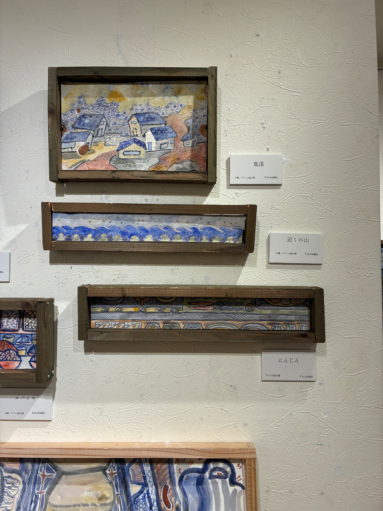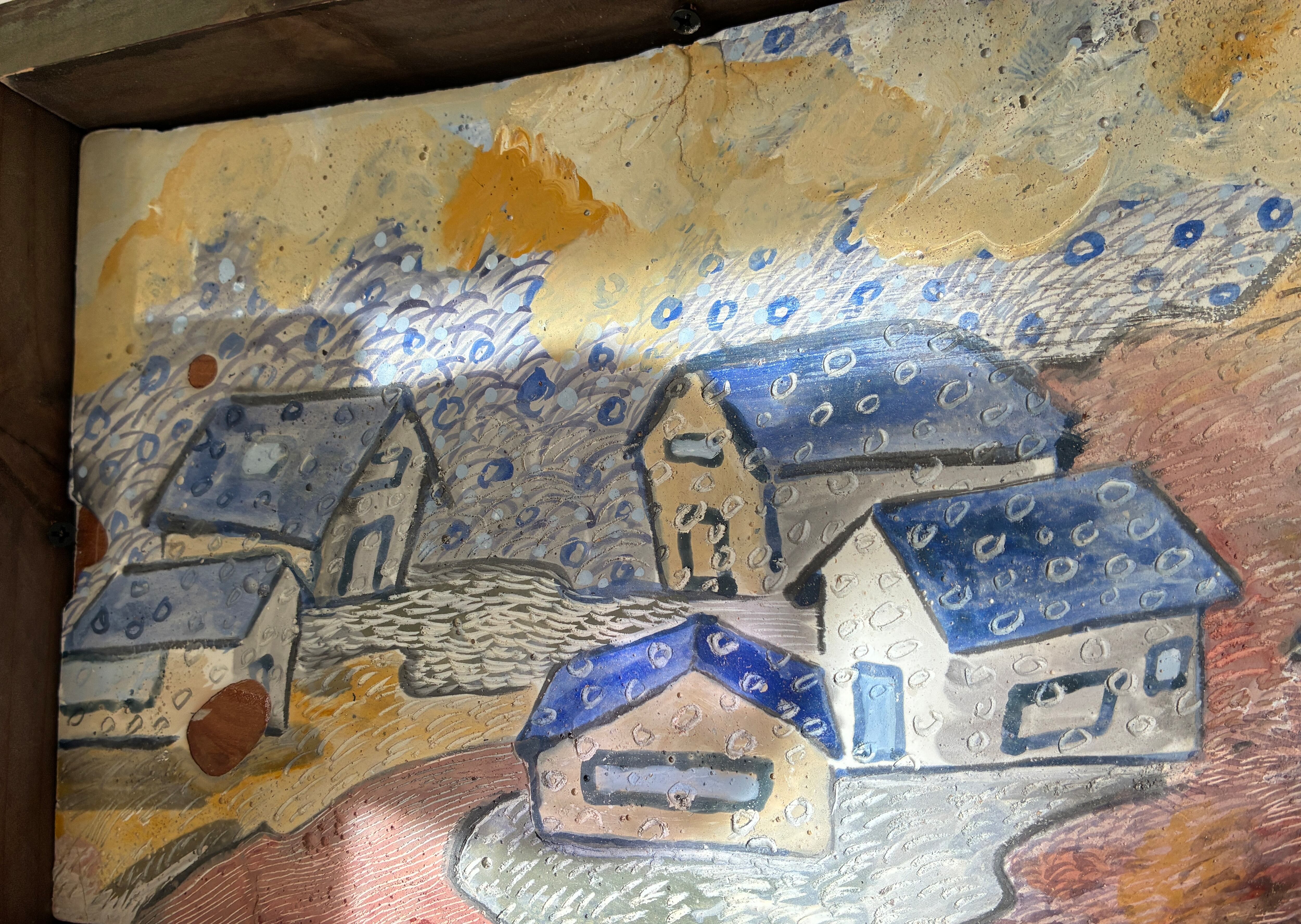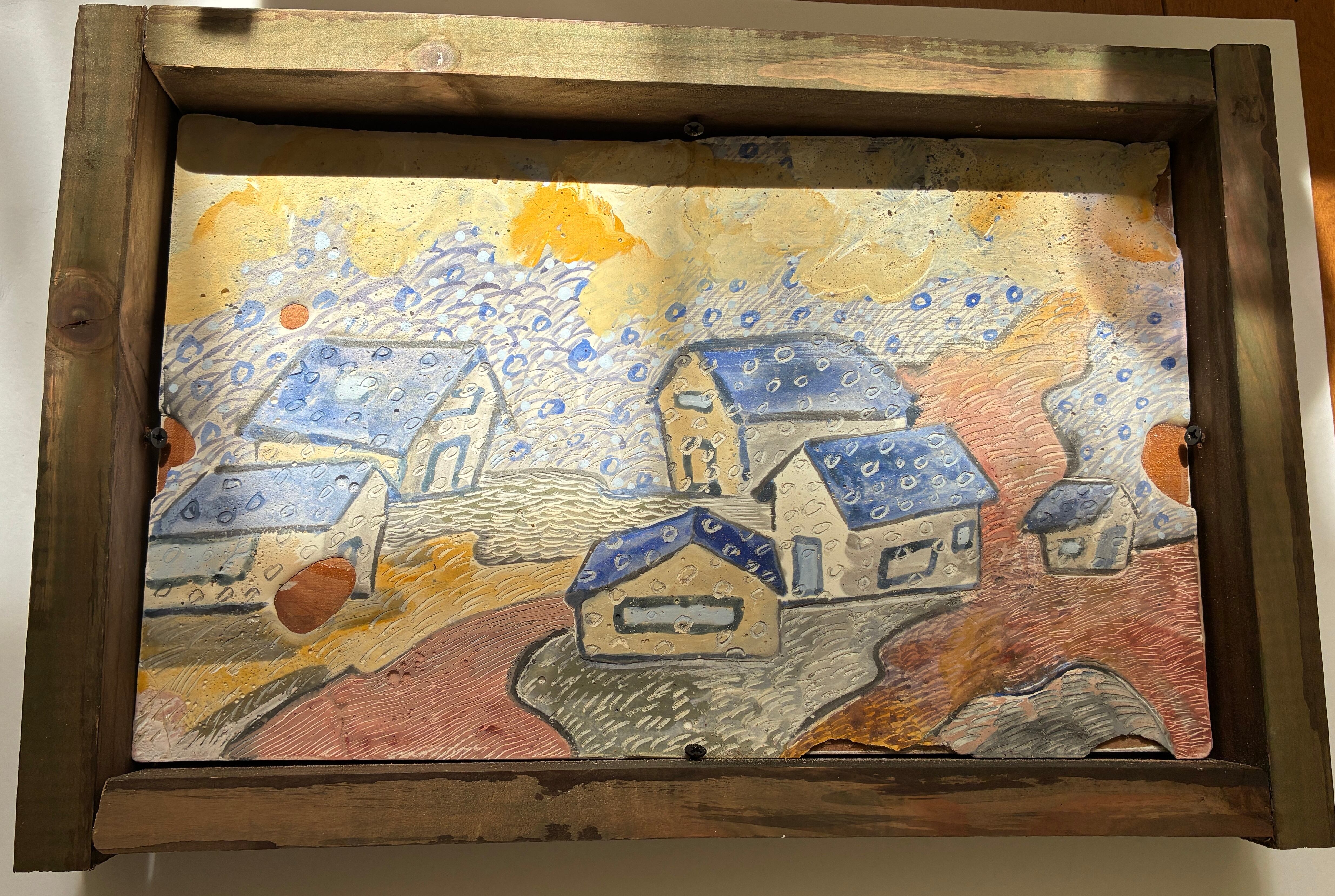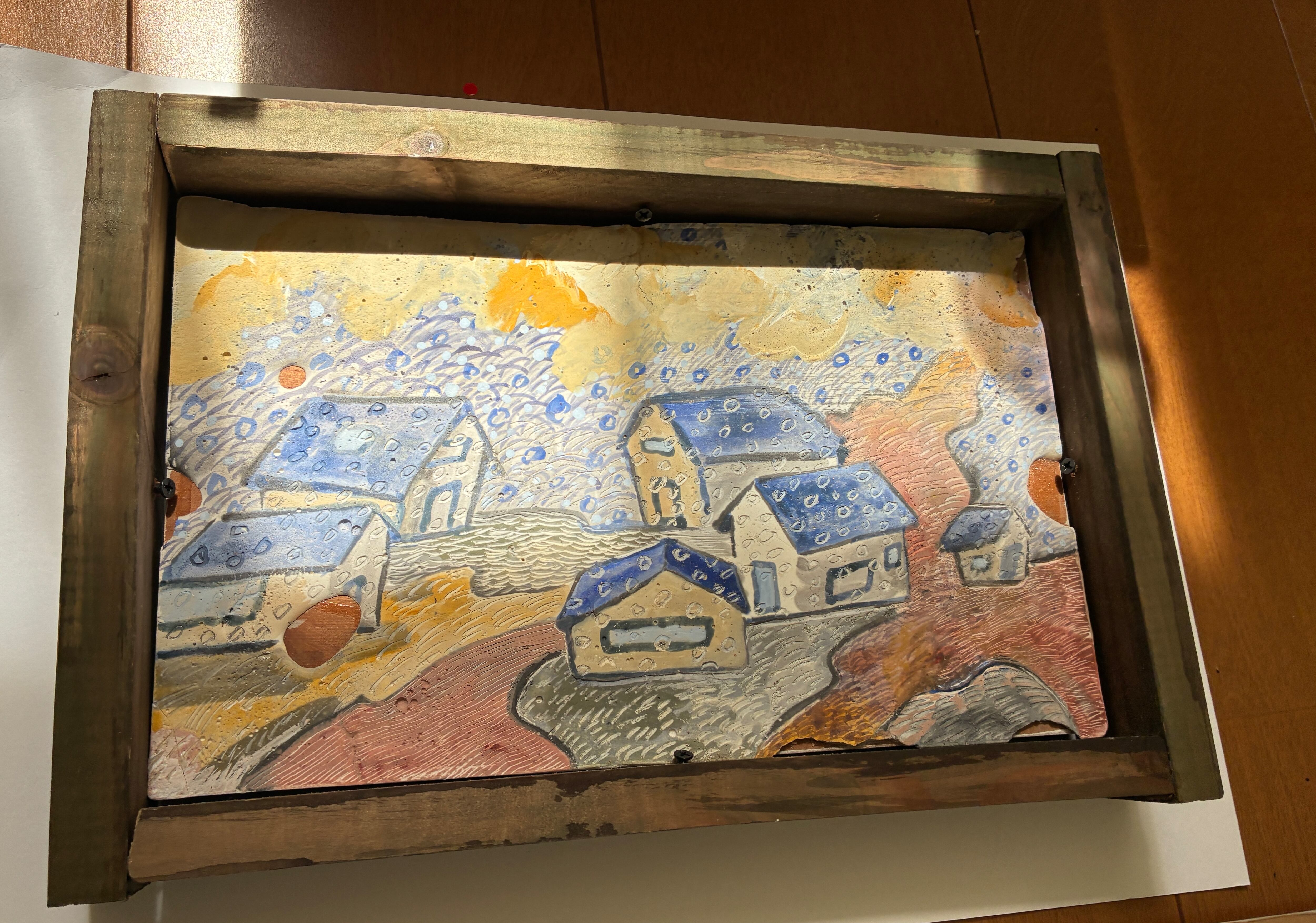 石膏の画面にアクリル絵の具で着彩後、模様をつけています。